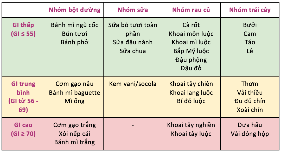 Người bệnh đái tháo đường nên chọn các thực phẩm có chỉ số GI thấp trong thực đơn dinh dưỡng mỗi ngày để kiểm soát đường huyết hiệu quả. Dựa trên chỉ số đường huyết (GI), các chuyên gia dinh dưỡng đã chia thực phẩm thành ba nhóm và phân loại bằng các màu xanh, vàng, đỏ như sau [5]: